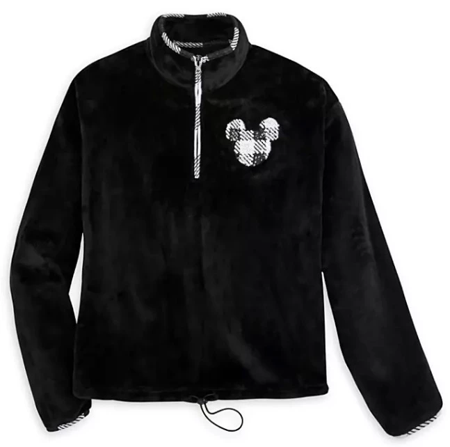 Enjoy the laid-back luxe lifestyle in this velvet pullover top featuring a black and white plaid sequin Mickey icon on the chest. The high collar with one-quarter zip closure will keep you cozy, while black and white plaid trim and a drawstring hem enhance your look. This Runs Small.