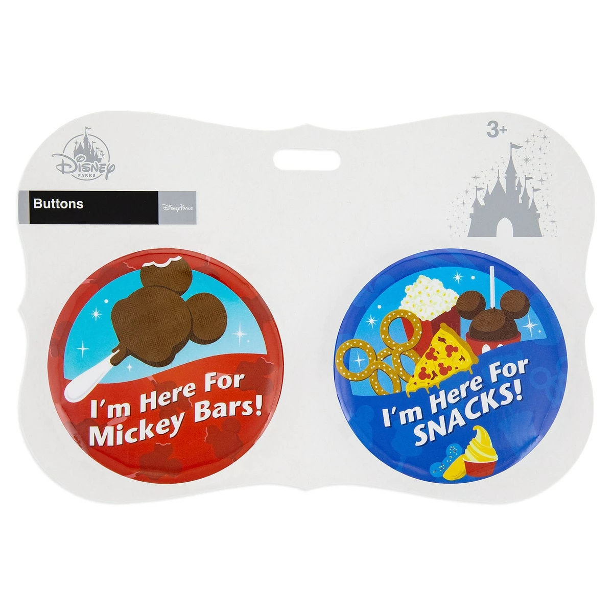 These fun Souvenir Buttons Features 2 Buttons with the saying “I’m Here for Mickey Bars” and “I’m Here for Snacks”.