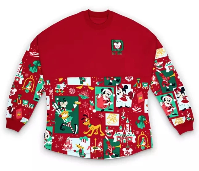 - Allover print on sleeves and lower body featuring Santa Mickey, Santa Minnie, Pluto, Goofy, Park attractions, and snowflakes