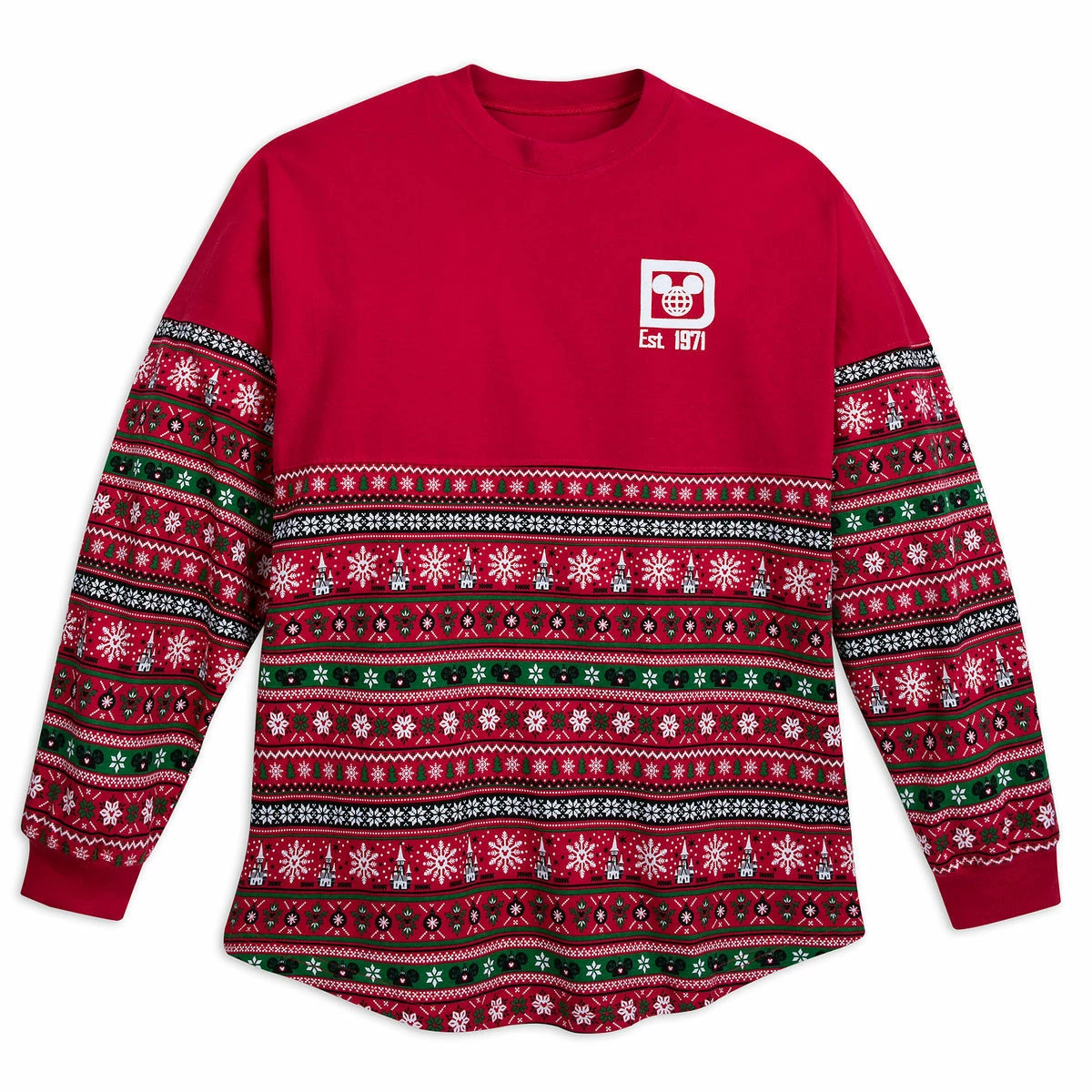 - Lower panels on sleeves and bodice feature allover Fair Isle-style print of Mickey Mouse ear hats as ornaments, snowflakes, trees, Fantasyland Castle, and geometric shapes