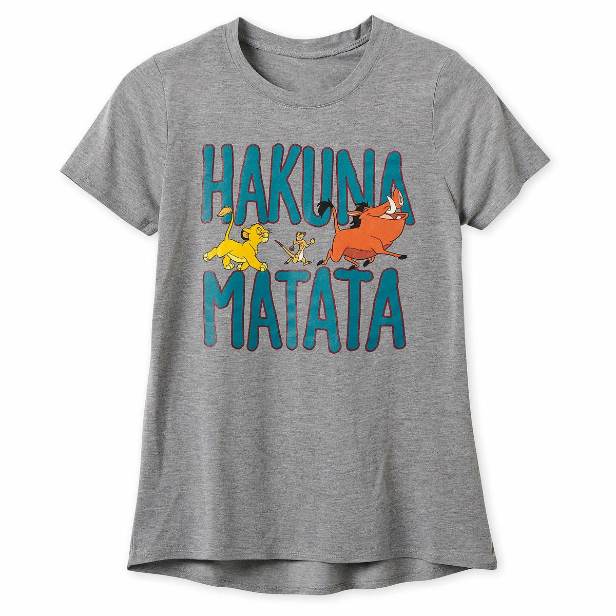 Embrace a worry-free mindset with every wear of this Lion King T-Shirt for women. Featuring screen art of Simba, Timon, and Pumbaa, this heathered tee is imbued with ”Hakuna Matata” vibes!