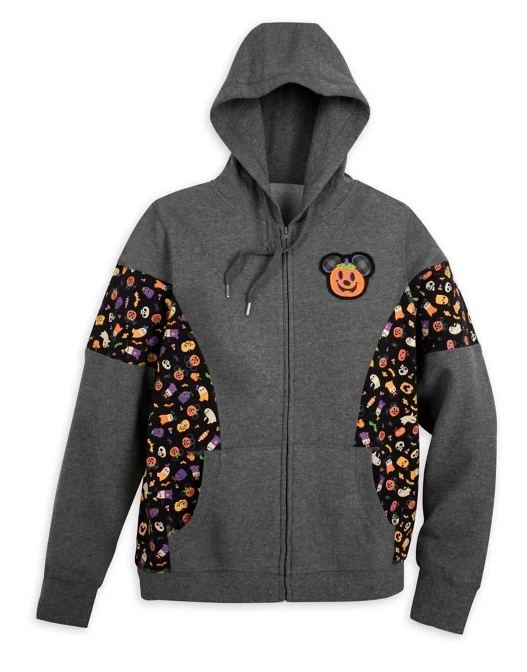 Cast a smiling spell in this Halloween zip hoodie featuring a Mickey Mouse jack-o’-lantern appliqué on the front. The pieced design includes a colorful print with bats, ghosts, more jack-o’-lanterns, and trick or treat candy to provide a taste of All Saints Eve.