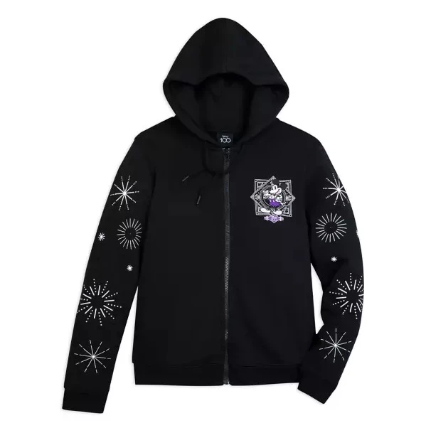 Go all out in this gorgeous Mickey Mouse Disney100 zip front hoodie. You’ll be celebrating in comfort and style thanks to super soft cotton fleece and screened and embroidered art that dazzles. Metallic foil print and black glitter embroidery set it apart as something truly special. On the back, Mickey, Minnie Mouse, Donald Duck, Daisy Duck, Goofy and Pluto are all smiles and ”Disney100” is emblazoned for all to cheer. On the front, Mickey is decked out in his finest, and the sleeves are festooned with a sparkly fireworks display.